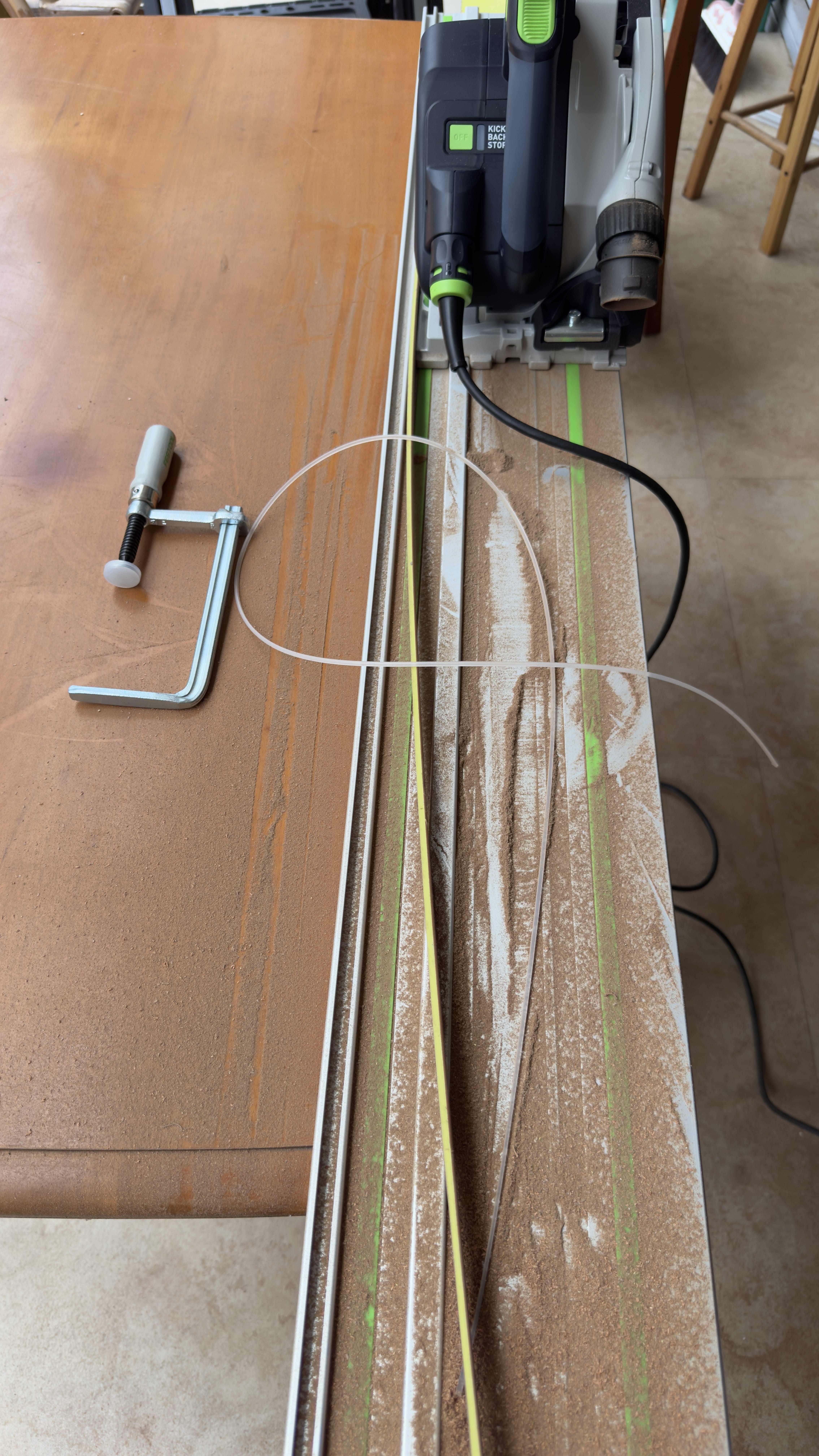 熟悉新工具,需要点时间。板材归方,要横平竖直,不爆边毛边,似乎不容易。常见的圆锯,只能干点粗活,精度超过5毫米,基本和家具粘不上边了。唯有轨道锯,离高端定制最后1毫米。