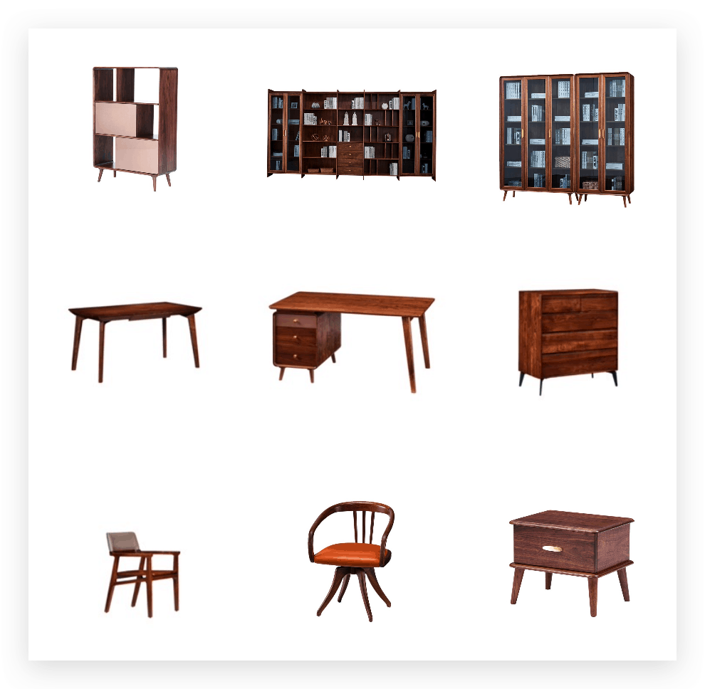 花了近一年时间,北上南下,选定了几十件黑胡桃木家具。传统经典,温润暖心。读书人最看重的是书桌和书柜。